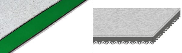 - لایههای رویی و زیرین: این لایهها از جنس برزنت هستند. برزنت خود از الیاف طبیعی یا مصنوعی مانند پلی استر، نایلون، کتان یا کنف بافته میشود و سپس برای مقاومت بیشتر در برابر آب و رطوبت، با موادی نظیر PVC یا پلی اورتان آغشته میگردد. این لایههای برزنتی، انعطافپذیری، مقاومت در برابر پارگی و قابلیت جذب ضربه را برای تسمه فراهم میکنند.