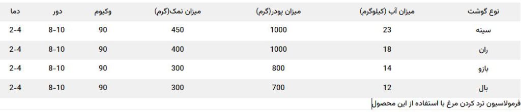 | نوع گوشت | میزان آب (کیلوگرم) | میزان پودر(گرم) | میزان نمک(گرم) | وکیوم | دور | دما |